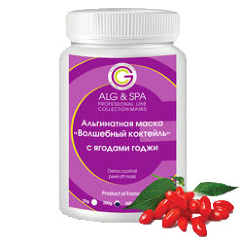 Альгинатная маска "Волшебный коктейль с ягодами годжи" (альгинат, куркума, ягоды годжи, диатомовая земля, малтодекстрим) .М аска содержит экстракт плода годжи и куркумы – активные натуральные компоненты, имеющие сертификат Ecocert. Ягоды годжи содержат полисахариды, флаваноиды и витамин С в большом количестве, которые прекрасно борются со старением клеток. Куркума омолаживает и очищает кожу, обладает прекрасными антибактериальными и успокаивающими свойствами, отлично борется с воспалительными процессами на коже. Благодаря этим компонентам, маска предотвращает старение кожи, дает мощный омолаживающий эффект, обладает антиоксидантным эффектом, подходит для всех типов кожи в том числе и проблемной. После применения, кожа упругая, гладкая, эластичная, здоровая.