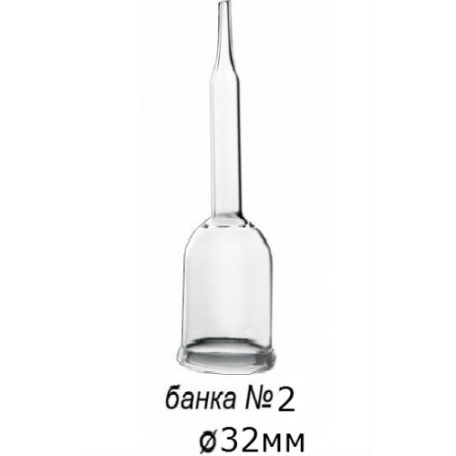 Вакуумная массажная банка №2 Ø 32 мм (стекло) Банка массажная для вакуумного аппарата. Стеклянная банка без отверстия для запуска воздуха, с носиком для подсоединения вакуума. Массажная банка без отверстия для воздуха - для работы по телу и по небольшим участкам. Размеры массажной банки: Общий наружный диаметр банки 32 мм, внутренний - 25 мм. Высота широкоый части банки около 5 см, высота носика около 7 см. Общая высота массажной банки 12 см. Используют для средних участков тела. Стеклянная прозрачная массажная банка для стандартного силиконового шланга к аппаратам МВТ-01, IM-818, NOVA 6401, NOVA 600 и др. Размеры банки могут немного отличаться одна от другой на 1-3 мм, так как отливаются из стекла. Перед продажей менеджер может замерять Вашу баночку, чтобы Вы знали точные размеры. Для каких участков применяется массажная банка Ø 32 мм: • Шея, зона декольте. • Плечи, руки. • Ноги, икры.