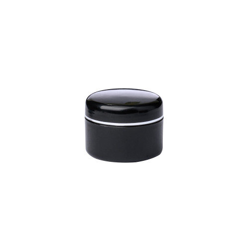 Баночка, емкостью 15мл с плотно закручивающейся крышкой качественное, комфортное, безопасное и небьющееся изделие из черного пластика для хранения и транспортировки продукции косметологического и бытового назначения (крема, лосьоны, сыпучие материалы и пр.). Крышка баночки декорирована серебрянной полоской.