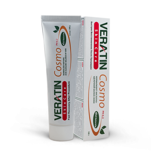 После лазерного воздействия и эпиляции оказывает успокаивающее и заживляющее действие. После завершения процедуры нанести крем Veratin Cosmo равномерно на подвергшийся воздействию участок кожи. В постпроцедурный период наносить не менее 2 раз в день.