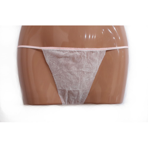 Стринги (трусики) женские одноразовые белые. Качественное и комфортное изделие из спанбонда, плотностью 23гр/м2. Высокая треугольная вставка спереди, тонкая полоска-стринг сзади. Резинка декорирована яркой ниткой. Упаковка: каждый стринг упакован в одноразовый п/э прозрачный пакет. Общее количество штук в упаковке 50+1шт. Используются как одноразовый расходный материал в косметологии для проведения: депиляции, массажа, SPA-процедур, обертываний и других процедур по телу. Резинка в изделии специально подобрана для комфорта работы с клиентом во время процедуры: мягкая, не врезается в тело, хорошо тянется, что облегчает в работе ее перемещение.