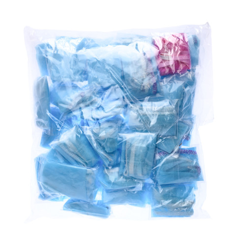 Стринги (трусики) женские одноразовые, белые. Качественное и комфортное изделие из спанбонда голубого цвета, плотности 23гр/м2. Высокая треугольная вставка спереди, тонкая полоска-стринг сзади. Резинка декорирована яркой ниткой. Упаковка: каждый стринг упакован в одноразовый п/э прозрачный пакет. Общее количество штук в упаковке 500+5шт. Используются, как одноразовый расходный материал в косметологии для проведения различных процедур по телу. Резинка в изделии специально подобрана для комфорта работы с клиентом во время процедуры: мягкая, не врезается в тело, хорошо тянется, что облегчает,при надобности, ее перемещение.