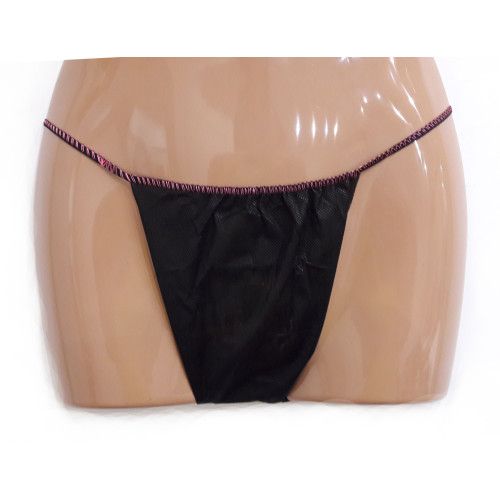 Стринги (трусики) женские одноразовые, черные. Качественное и комфортное изделие из спанбонда черного цвета, плотности 40гр/м2. Высокая треугольная вставка спереди, тонкая полоска-стринг сзади. Резинка декорирована яркой ниткой. Упаковка: каждый стринг упакован в одноразовый п/э прозрачный пакет. Общее количество штук в упаковке - поштучно. Используются, как одноразовый расходный материал в косметологии для проведения различных процедур по телу. Резинка в изделии специально подобрана для комфорта работы с клиентом во время процедуры: мягкая, не врезается в тело, хорошо тянется, что облегчает,при надобности, ее перемещение.